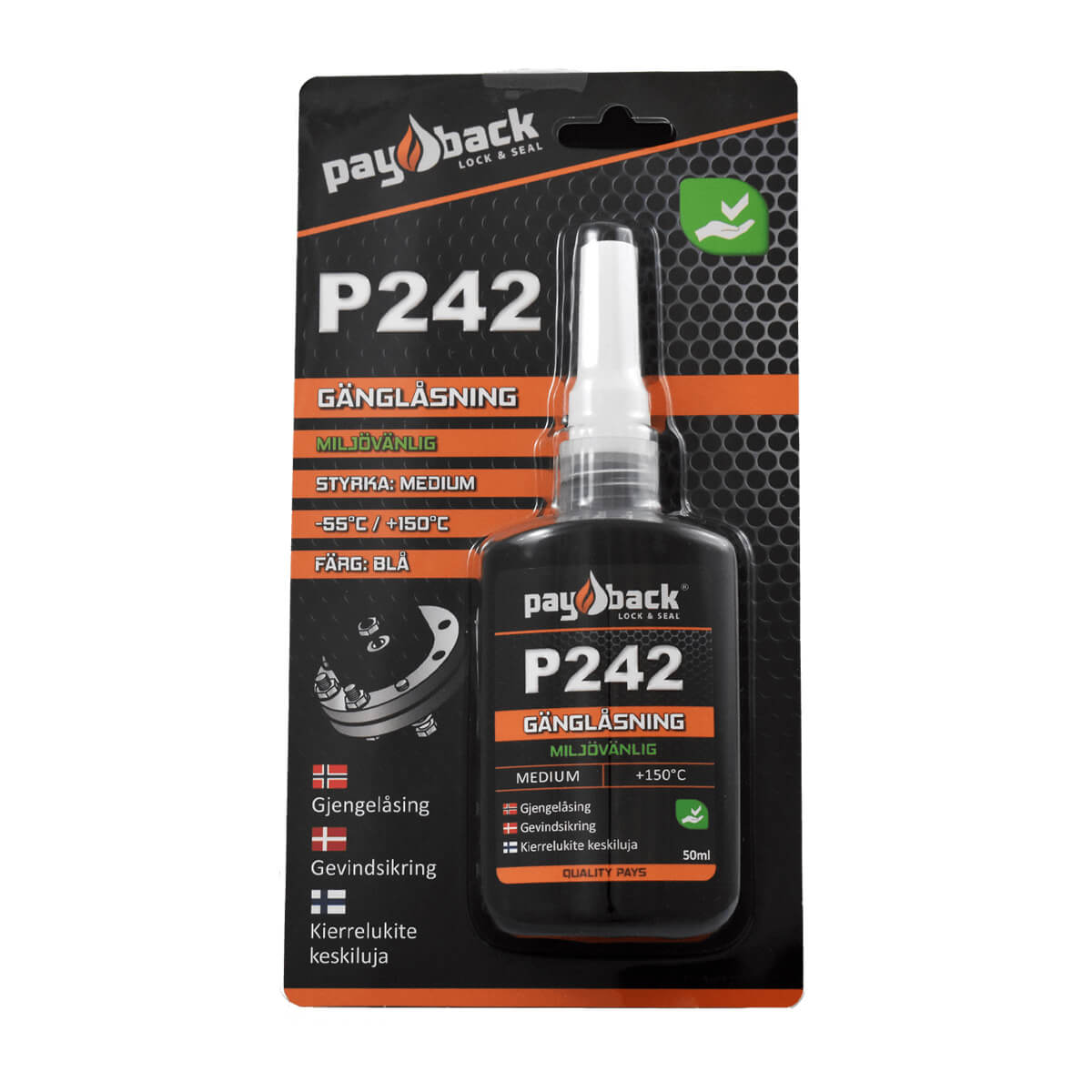 P242 er en gevindsikring med medium styrke. Giver en hurtig sikring og forsegling af f.eks. boltsamlinger. P242 er vibrationssikker, demonteringsbar og dækker ca. 80% af behovet for gevindsikring. Behandlede dele samles let, da limen fungerer som smøremiddel. Den tixotropiske vedhæftning gør at produktet hverken løber eller drypper ved montering. P242 er brugervenligt med “hvidt sikkerhedsdatablad” Ikke klassificeret (CLP).