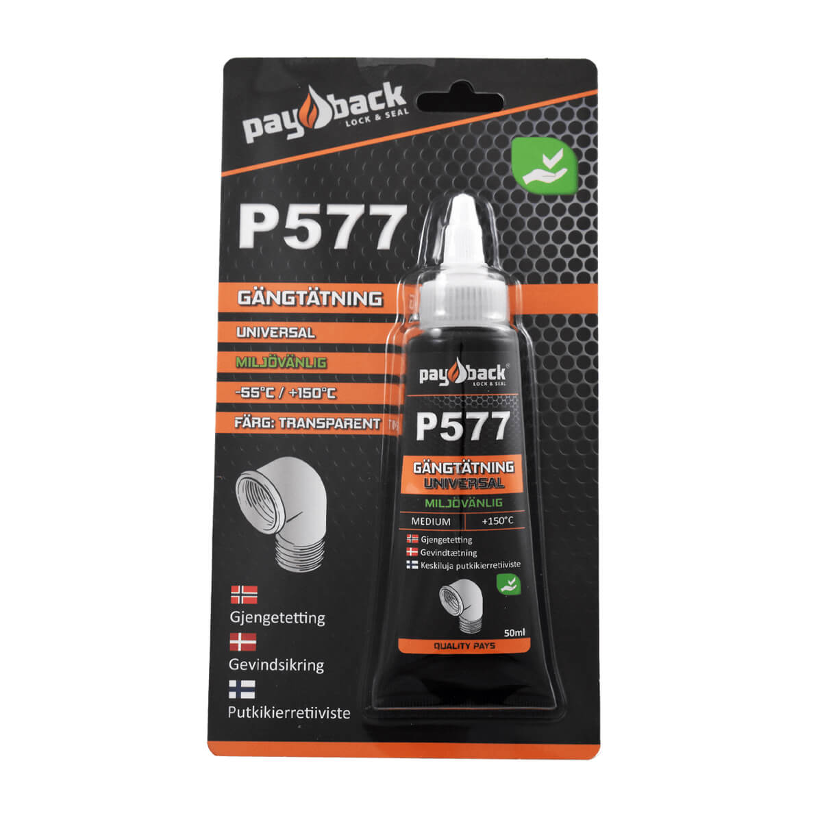 P577 Gevind- og rørtætner som er særligt universal ved tætning og låsning af rørgevind og andre gevindskårne dele. Forsegler straks optil 10 bars tryk og 350 bar efter 24 timer. P577 yder meget god modstand mod kemikalier og opløsningsmidler. P577 er fri for opløsningsmidler og har “hvidt sikkerhedsdatablad” ikke klassificeret (CLP).