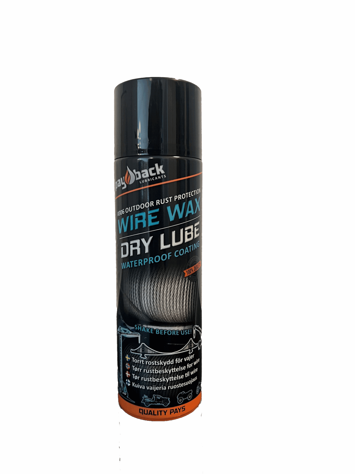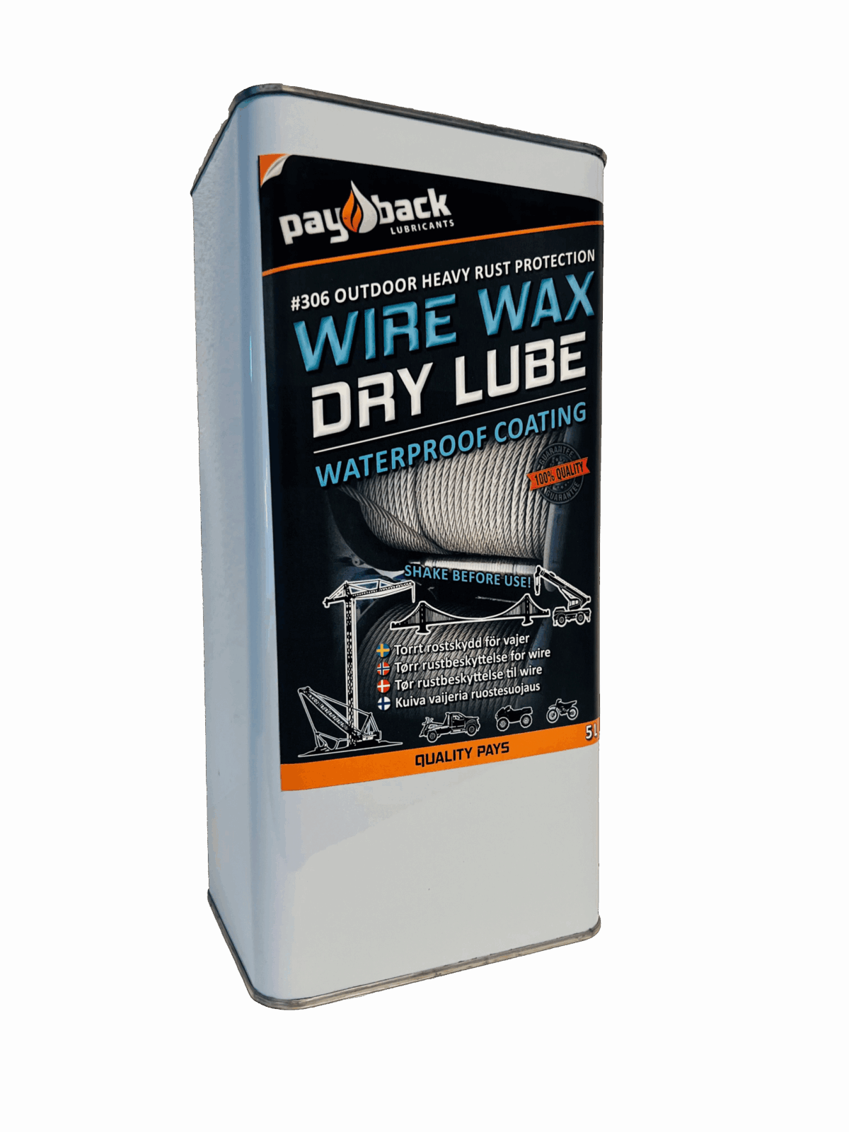#306 WIRE LUBE er et unikt wirebeskyttelsesmiddel på verdensmarkedet. Beskytter og smører med en kraftig, fleksibel og selvhelende, tør voksbelægning med høj rustbeskyttelse. Binder ikke snavs og er resistent over for kemiske angreb og saltvand. Meget brugervenlig i ethvert klima.